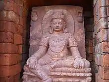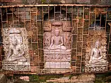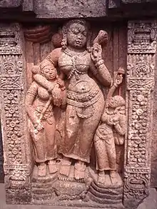 Around the entrance were a number of large relief panels of standing figures, several now removed elsewhere. On the outside wall the only one left in place is the female figure (illustrated) holding a flowering branch and making the varadamudra with her proper right hand. She is perhaps a river goddess, or Marici.[18] In a niche inside the porch is an image of the river goddess Yamuna in "sisterly cameraderie" with two smaller companions (illustrated below). There was probably a matching Ganga panel on the other side, but this is now missing; the pair are very common figures at the threshold of Buddhist and Hindu establishments.[19] Other common figures in monasteries are pairs of Pancika (the Hindu Kubera) and his consort Hariti, representing material and spiritual wealth at more than one level.[20] The style of these figures demonstrates that they were made at the same period as the sculpture on the Baitala Deula Hindu temple in Bhubaneswar, and it has been suggested that some individual sculptors worked at both sites, "a lack of sectarian specialization" in builders and carvers in India being very common.[21]