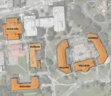 The first hall, Wellman, is a Classical Revival building designed in 1912 by John Galen Howard and named after Harry R. Wellman, a professor of Agricultural Economics, and acting president of the University.[17]