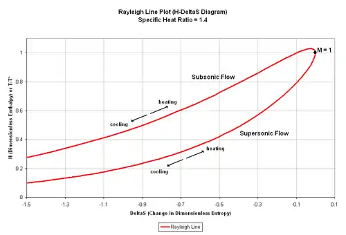 The above equation can be manipulated to solve for M as a function of H. However, due to the form of the T/T* equation, a complicated multi-root relation is formed for M = M(T/T*). Instead, M can be chosen as an independent variable where ΔS and H can be matched up in a chart as shown in Figure 1. Figure 1 shows that heating will increase an upstream, subsonic Mach number until M = 1.0 and the flow chokes. Conversely, adding heat to a duct with an upstream, supersonic Mach number will cause the Mach number to decrease until the flow chokes. Cooling produces the opposite result for each of those two cases. The Rayleigh flow model reaches maximum entropy at M = 1.0 For subsonic flow, the maximum value of H occurs at M = 0.845. This indicates that cooling, instead of heating, causes the Mach number to move from 0.845 to 1.0 This is not necessarily correct as the stagnation temperature always increases to move the flow from a subsonic Mach number to M = 1, but from M = 0.845 to M = 1.0 the flow accelerates faster than heat is added to it. Therefore, this is a situation where heat is added but T/T* decreases in that region.