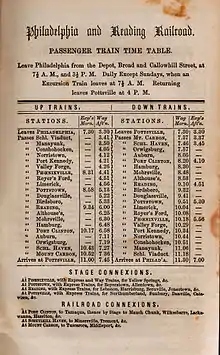 The Philadelphia and Reading Railroad (P&R) was one of the first railroads in the United States. Along with the Little Schuylkill, a horse-drawn railroad in the Schuylkill River Valley, it formed the earliest components of what became the Reading Company. Primarily, the P&R was constructed to haul anthracite coal from the mines in northeastern Pennsylvania's Coal Region to Philadelphia.[2]