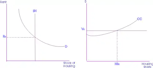In the adjacent diagram, the stock of housing supply is presented in the left panel while the new flow is in the right panel. There are four steps in the basic adjustment mechanism. First, the initial equilibrium price (Ro) is determined by the intersection of the supply of existing housing stock (SH) and the demand for housing (D). This rent is then translated into value (Vo) via discounting cash flows. Value is calculated by dividing current period rents by the discount rate, that is, as a perpetuity. Then value is compared to construction costs (CC) in order to determine whether profitable opportunities exist for developers. The intersection of construction costs and the value of housing services determine the maximum level of new housing starts (HSo). Finally the amount of housing starts in the current period is added to the available stock of housing in the next period. In the next period, supply curve SH will shift to the right by amount HSo.