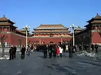 After Li's message was unable to get through, Cao began the assault on Dongan Gate, East Chang'an Gate, and West Chang'an Gate, setting fire to the western and eastern gates; these fires were extinguished later in the day by pouring rain.[20] Defending these gates were 5,610 imperial bodyguards, who were generously rewarded after the conflict for their merit in maintaining a strong defense.[22] Ming troops poured into the area outside the Imperial City to counterattack; Li Xian and Wang Ao were able to flee, but Wu Jin and the head of the Censorate, Kou Shen (寇深; 1391–1461), were killed by Cao's soldiers.[23] Kou had earlier denounced Cao as a criminal and was an associate of Lu Gao; when Cao's soldiers found Kou in a waiting room outside Chang'an Gate, he cursed at them before they cut him down.[23]