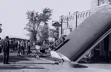 In 1957, an accident knocked down the forecourt awning and damaged the gasoline pumps, then ten years later a fire started in the kitchen and destroyed most of the Tavern.[51] What was left standing at the site was stripped and carried off by souvenir hounds. Fueled by the renewed interest in the Barrows from the 1967 movie, merchants in Weston actually sold bricks from the building for $1 apiece on the street during the late 1960s.[50] However, changing highways ultimately ended the business, as the construction of access roads for the nearby interstate demanded the demolition of the Red Crown and Slim's Castle.[51]