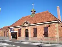 Erected in 1892, the exterior of Redfern Station consists of a main entrance building and ticket office, built of brick in a Federation Queen Anne style with terracotta tiled hipped roof with central cupola and ornamental fleche. The central building is accessed from Lawson Street via the original central arched doorway flanked with sandstone columns and pediment or via a larger entrance to the east, which replaced an earlier arched window. Sandstone quoin blocks feature at the corners of the central portion of the entrance building, with sandstone keystones above the windows and doors and sandstone sills. A number of additions to the entrance building are visible along the Lawson Street frontage.[2]