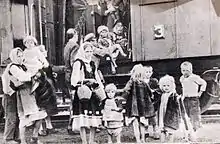 Thousands of Macedonian, Greek, and Aromanian children were evacuated from the areas under communist control. A United Nations Special Committee on the Balkans (UNSCOB) report confirms that villages with an ethnic Macedonian population were far more willing to let their children be evacuated.[10] They are now known as Децата Бегалци (Decata Begalci) "the Refugee Children" in North Macedonia and the ethnic Macedonian diaspora.[24] It is estimated that from 28,000 children to 32,000 children were evacuated in the years 1948 and 1949.[10] According to some sources, the majority of the children sent to the Eastern Bloc had an ethnic Macedonian origin and spoke their native Macedonian language,[10] but this is disputed by official KKE documents and statements made by political refugees in the years after the evacuation.[25][26] Exceptions were made for children under the age of two or three who stayed with their mothers while the rest should be evacuated. Many of these children were spread throughout the Eastern Bloc by 1950 there were 5,132 children in Romania, 4,148 in Czechoslovakia, 3,590 in Poland, 2,859 in Hungary and 672 had been evacuated to Bulgaria.[10]