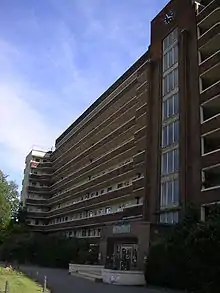 Regent Court was built round three sides of a square with the open side facing south and is nine storeys high in the main block and seven storeys on the east and west wings with a central entrance leading to a communal lounge. The central block and each wing have a lift though these are quite small and slow; there is no service lift. In total, it comprises 202 flats, ranging from one to three bedrooms which are accessed along open balcony walkways. The heating at Regent Court was included with the rent as was the constant supply of hot water and the rates. Each flat was self contained and also had its own sun balcony; some of those have now been incorporated into the internal living space of the flat. Kitchenettes were equipped with modern devices and the bathrooms had both a toilet and a bath. There was an on site laundrette. Each flat owner has to contribute to the cost of upkeep/maintenance of the block and pay for things like the caretaker's wage, gardening, heating etc.