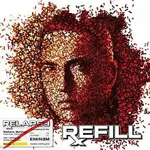 The album cover for Relapse was first published through Eminem's Twitter account on April 21, 2009.[13] It illustrates a head shot of the rapper composed by a mosaic of thousands of pills. A sticker on the cover resembles a prescription drug label, on which the patient is Eminem and the prescribing doctor is Dr. Dre.[13] Gil Kaufman of MTV News described the cover as a reference to the rapper's struggle and addiction to prescription drugs, adding that it follows Eminem's habit of displaying personal issues in his art.[13] The album booklet and back cover follow a pill prescription design. On the backside of the booklet is a dedication to Proof, where Eminem explains that he's sober and that he tried to write a song for him, but that he didn't find one of them good enough therefore he dedicates the whole album to him. The CD itself is meant to represent the lid on a bottle of prescription pills, grey with the big red inscription "Push Down & Turn".[83] The cover for Relapse: Refill is the same, with the background color changed from black to white. The prescription drug label is scratched out and the writing "Refill" is posed next to it.[84]