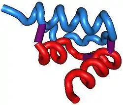Relaxin-3 consists of 51 amino acids in humans which are arranged into a two-chain structure (designated the A-chain and B-chain). There are three disulfide bonds (two interchain, one intrachain), with the residues that mediate binding to/activation of RXFP3 residing within the B-chain. At translation, pro-relaxin-3 also contains a C-chain (in between the A and B-chains) which is removed via protolytic cleavage to form the mature neuropeptide.[3]