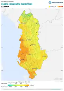 Renewable energy in Albania includes biomass, geothermal, hydropower, solar, and wind energy.[1] Albania relies mostly on hydroelectric resources, therefore, it has difficulties when water levels are low. The climate in Albania is Mediterranean, so it possesses considerable potential for solar energy production.[2] Mountain elevations provide good areas for wind projects. There is also potentially usable geothermal energy because Albania has natural wells.