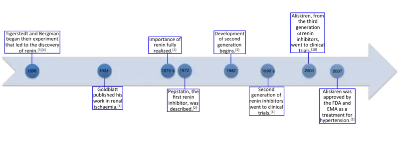 In 1896, the Finnish physiologist Robert Tigerstedt and the Swedish physician Per Bergman did an experiment on kidneys and the circulatory system in rabbits. They observed that blood pressure rose in the rabbits when extracts of the kidneys were injected into their jugular veins.[9][10] They also discovered this substance responsible for higher blood pressure was produced in the renal cortex, and they named it renin.[10] Although this experiment laid the foundation for future investigations into the RAAS pathway, it had little impact on the scientific community at that time.[9][11] In 1934, when Goldblatt published his work in renal ischaemia, renin came into focus again. The importance of renin in the pathogenesis of cardiovascular disease was, however, not fully understood until in the 1970s, and 20 years later the first renin inhibitors went to clinical trials.[7]