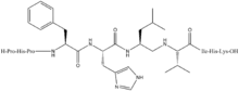 Pepstatin was the first synthetic renin inhibitor. It is of microbial origin and is an N-acyl-pentapeptide, more accurately: isovaleryl-L-valyl-L-valyl-statyl-L-alanyl-statine.[8][29] Pepstatin was found to be a potent competitive inhibitor of most aspartic proteases, but a weak inhibitor of renin.[30] Originally, it was thought to be effective in the treatment of duodenal ulcers, and went through clinical trials, but had no success.[31][32] Statine, an amino acid, is thought to be responsible for the inhibitory activity of pepstatin, because it mimics the tetrahedral transition state of the peptide catalysis.[33] Because of hydrophobic properties of statine, pepstatin has very low solubility in physiological media.[34] Since it had low potency and poor solubility, it did not enter in vivo studies.