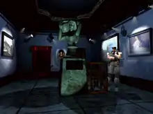 During the first six months of development, Mikami worked on the game alone, creating concept sketches, designing characters, and writing over 40 pages of script.[21] Several of the Resident Evil mansion's pre-rendered backdrops were inspired by The Overlook Hotel, the setting for the 1980 horror film, The Shining.[22] Mikami also cited the 1979 film Zombie as a negative inspiration for the game.[23] The game was initially conceived as a fully 3D first-person update of Sweet Home (influenced by the game's first-person battles), with action and shooting mechanics. A first-person prototype was produced, and initially featured a supernatural, psychological Japanese horror style similar to Sweet Home, before opting for an American zombie horror style influenced by George Romero films. During production, Mikami discovered Alone in the Dark (1992), which influenced him to adopt a cinematic fixed-view camera system. Mikami said that, if it wasn't for Alone in the Dark, Resident Evil would have had a first-person view instead.[13][24] Mikami was initially reluctant to adopt Alone in the Dark's fixed-view camera system, saying it "had an effect on immersion, making the player feel a bit more detached", but eventually adopted it because the use of pre-rendered backdrops allowed a higher level of detail than his fully 3D first-person view prototype, which "didn't get along so well with the original PlayStation's specs."[7] Only a single concept art of the original first-person prototype has been available since the 1990s, showing more similarity to Doom rather than Alone in the Dark.[25] A first-person perspective was not used again for the mainline Resident Evil series until Resident Evil 7: Biohazard.[26]
