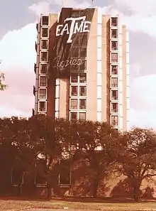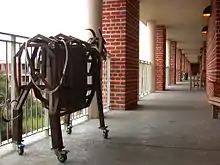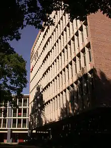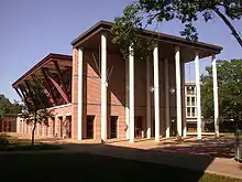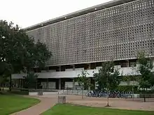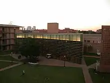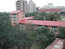 Wiess Hall was completed in 1949, but carried the name "North Hall" until its dedication in March 1950.[40] It was laid out as a W-shaped building, with three north–south wings, joined on the north ends by a long east–west spine, forming two open quadrangles.[41] The building was two stories high except for the three-story center wing. The hall was designed to house about 200 students in 20 single and 90 double rooms. Each room at Wiess opened directly to an exterior walkway that wrapped around the entire building. This design incorporated two features that were innovative at the time: every room had a semi-private bathroom and every room (except room 228, which was reserved for freshmen) had windows on at least two sides—an important adaptation in the years before air conditioning.[42]