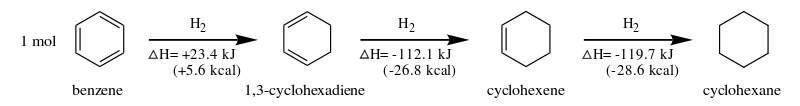 Hydrogenation of one mole of double bonds delivers 119.7 kJ (28.6 kcal), as can be deduced from the last step, the hydrogenation of cyclohexene. In benzene, however, 23.4 kJ (5.6 kcal) are needed to hydrogenate one mole of double bonds. The difference, being 143.1 kJ (34.2 kcal), is the empirical resonance energy of benzene. Because 1,3-cyclohexadiene also has a small delocalization energy (7.6 kJ or 1.8 kcal/mol) the net resonance energy, relative to the localized cyclohexatriene, is a bit higher: 151 kJ or 36 kcal/mol. [22]