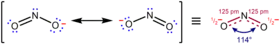 For instance, in NO2–, nitrite anion, the two N–O bond lengths are equal, even though no single Lewis structure has two N–O bonds with the same formal bond order. However, its measured structure is consistent with a description as a resonance hybrid of the two major contributing structures shown above: it has two equal N–O bonds of 125 pm, intermediate in length between a typical N–O single bond (145 pm in hydroxylamine, H2N–OH) and N–O double bond (115 pm in nitronium ion, [O=N=O]+). According to the contributing structures, each N–O bond is an average of a formal single and formal double bond, leading to a true bond order of 1.5. By virtue of this averaging, the Lewis description of the bonding in NO2– is reconciled with the experimental fact that the anion has equivalent N–O bonds.