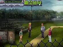The game's graphics have what IGN called a "retro, low-res pixel art aesthetic".[1] After a series of brief vignettes in which the player controls one character at a time, they are able to switch between any of the four characters at will, using the menu at the top of the screen. They are controlled through a simplified point and click interface, in the style of traditional adventure games from LucasArts and Sierra Entertainment. Many puzzles require multiple characters in order to solve them, such as one in which Ed must crawl into a ventilation shaft while Bennett controls the flow of water through a series of pipes. All four protagonists have areas only they can access or characters who only they can speak to, though most actions can be performed by any of them. All four will offer slightly different descriptions of objects or characters when looking at them.
