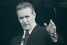 Humbard's television programs featured gospel music such as the popular Cathedral Quartet. Humbard's wife, Maude Aimee, and his children were also often featured on the programs. His ministry eventually extended to Canada, Europe, the Middle East, Far East, Australia, Latin America and Africa, giving it a worldwide reach of 20 million viewers, greater than any of his contemporaries by the late 1970s.[1] In Brazil, he attracted large crowds at the giant soccer stadium in São Paulo for weeks. Humbard officiated at Elvis Presley's funeral, as Presley had been an admirer of Humbard's ministry.[4][5][6]
