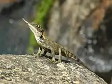 The rhino-horned lizard (Ceratophora stoddartii), also commonly known as Stoddart's unicorn lizard and the horned agama, is a species of lizard in the family Agamidae. The species is endemic to Sri Lanka. It is called kagamuva angkatussa-කගමුව අං කටුස්සා in Sinhala.