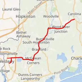 Crossing over swampland, Route 91 intersects with Bradford Road, where it turns north along Bradford. The road crosses through some small communities in Westerly, returning to a parallel with the Northeast Corridor. Entering a small commercial center in the town of Westerly, Route 91 continues northeast as Bradford Road and intersects with Route 216. Route 91 and Route 216 proceed north along a concurrency, crossing over the Northeast Corridor. Paralleling the Pawcatuck River, Routes 91 and 216 leave the town of Westerly for the town of Hopkinton.[2]