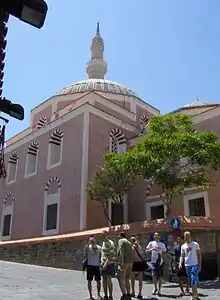 In 1912 Italian troops took the island over with the rest of the Dodecanese Islands, and established an Italian possession known as Italian Islands of the Aegean in 1923.[8] The architect Florestano Di Fausto can be considered the father of Italian Rhodes. He, in agreement with governor Mario Lago, was author of the city plan of 1923, choosing to respect almost totally the walled town, only demolishing the houses that were built on and around the city walls during the Ottoman era. He also turned the Jewish and Ottoman cemeteries into a green zone surrounding the Medieval Town.[8] At the same time, he designed the new Italian Rhodes in the zone of the Mandraki, planning a Garden City, and building along the main sea promenade the main edifices, as the Market, the Cathedral of Saint John of the Knights, the Palace of the governor. All these building were designed in an eclectic style, mixing Ottoman, Venetian, Renaissance and local elements. The Italians preserved what was left from the Knights' period, and destroyed all Ottoman buildings. They also reconstructed the Grand Master's Palace.[8] Furthermore, an Institute for the study of the History and Culture of the region was established, and major infrastructure work was done to modernize Rhodes.[8]