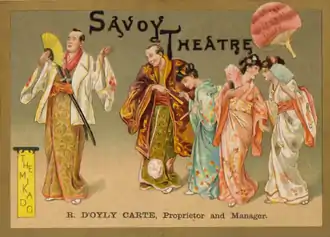 Carte produced the first revival of The Sorcerer, together with Trial by Jury, and matinees of The Pirates of Penzance played by a cast of children, while he waited for his partners to finish writing the new work. This became the partnership's most successful opera, The Mikado, which opened in March 1885.[105] The piece satirised British institutions by setting them in a fictional Japan and took advantage of the Victorian craze for the exotic and "picturesque" Far East.[106] The Mikado became the partnership's longest-running hit, lasting for 672 performances at the Savoy Theatre, and supplanting Patience as the second-longest-running work of musical theatre up to that time.[66] It was extraordinarily popular in the US and worldwide and remains the most frequently performed Savoy Opera.[107] The partnership's next opera was Ruddigore, which opened in January 1887. The piece, though a financial success, was a relative disappointment after the extraordinary run of The Mikado.[108] When Ruddigore closed after 288 performances over nine months, Carte mounted revivals of earlier Gilbert and Sullivan operas at the Savoy for almost a year.[109] After another attempt by Gilbert to persuade Sullivan to set a "lozenge plot", Gilbert met his collaborator half way by writing a serio-comic plot for The Yeomen of the Guard, which premiered in October 1888.[110] The opera ran for over a year, with strong New York and touring productions. This was a happy time for Carte, with a long-running opera, new marriage and new hotel and opera house under construction.[105] When Carte asked his partners for a new work, Sullivan again expressed reluctance to write another comic opera, asking if Gilbert would write a "dramatic work on a larger musical scale".[111] Gilbert declined but offered a compromise that Sullivan ultimately accepted: the two would write a light opera for the Savoy, and at the same time, Sullivan could work on a grand opera that Carte would produce at a new theatre he was planning to build to present British grand opera.[112] The new comic opera was The Gondoliers, which opened in December 1889 and became one of the partnership's greatest successes, with an initial run of 554 performances.[113]