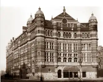 Carte's first production at the Royal English Opera House was of Sullivan's only grand opera, Ivanhoe, which opened in January 1891. It played for an initial run of 155 performances, a record for an opera. When it finally closed in July, Carte had no new work ready to play at the opera house, and so it had to close. The opera house re-opened in November 1891 with André Messager's La Basoche at first alternating in repertory with Ivanhoe, and then La Basoche played alone, closing in January 1892.[1] Carte again had no new opera to present at the house, and the venture soon failed. Sir Henry Wood, who as young man had been répétiteur for the production, recalled in his autobiography, "If D'Oyly Carte had had a repertory of six operas instead of only one, I believe he would have established English opera in London for all time. Towards the end of the run of Ivanhoe I was already preparing The Flying Dutchman with Eugène Oudin in the name part. He would have been superb. However, plans were altered and the Dutchman was shelved."[121] Carte leased the theatre to Sarah Bernhardt for a season and finally abandoned the project. He sold the opera house at a loss to the impresario Sir Augustus Harris.[1] It was then converted into a music hall, the Palace Theatre of Varieties, and later became the Palace Theatre.[122][123]
