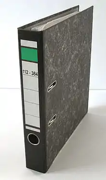 Ring binders (loose leaf binders, looseleaf binders, or sometimes called files in Britain) are large folders that contain file folders or hole punched papers. These binders come in various sizes and can accommodate an array of paper sizes. These are held in the binder by circular or D-shaped retainers, onto which the contents are threaded. The rings themselves come in a variety of sizes, including 0.5", 1", 1.5", and 2", though other sizes are also available. The rings are usually spring-loaded, but can also be secured by lever arch[1] mechanisms or other securing systems. The binders themselves are typically made from plastic with metal rings. Early designs were patented during the early 1890s to the early 1900s.