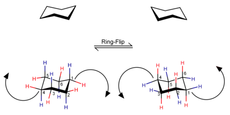 In organic chemistry, a ring flip (also known as a ring inversion or ring reversal) is the interconversion of cyclic conformers that have equivalent ring shapes (e.g., from a chair conformer to another chair conformer) that results in the exchange of nonequivalent substituent positions.[1] The overall process generally takes place over several steps, involving coupled rotations about several of the molecule's single bonds, in conjunction with minor deformations of bond angles. Most commonly, the term is used to refer to the interconversion of the two chair conformers of cyclohexane derivatives, which is specifically referred to as a chair flip, although other cycloalkanes and inorganic rings undergo similar processes.