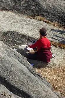 A ritual is a sequence of activities involving gestures, words, actions, or objects, performed in a sequestered place and according to a set sequence.[1] Rituals may be prescribed by the traditions of a community, including a religious community. Rituals are characterized, but not defined, by formalism, traditionalism, invariance, rule-governance, sacral symbolism, and performance.[2]