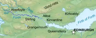The Forth rises in the Trossachs, a mountainous area 30 km (19 mi) west of Stirling. Ben Lomond's eastern slopes drain into the Duchray Water which meets with Avondhu River coming from Loch Ard. The confluence of these two streams is the nominal start of the River Forth.[4] From there it flows roughly eastward, through Aberfoyle, joining with the Kelty Water, about 5 km further downstream. The flat expanse of the Carse of Stirling follows including Flanders Moss. It is joined by the River Teith (which itself drains Loch Venachar, Loch Lubnaig, Loch Achray, Loch Katrine, and Loch Voil) just west of the M9, the next tributary being the Allan Water just east of that motorway. From there it meanders into the ancient port of Stirling. At Stirling the river widens, becomes tidal,[5] and it is here that the last (seasonal) ford of the river exists. From Stirling, the Forth flows east accepting the Bannock Burn from the south before passing the town of Fallin. Two towns of Clackmannanshire are then passed: firstly Cambus (where it is joined by the river Devon), closely followed by Alloa. Upon reaching Airth on the south shore and Kincardine on the north, the river begins to widen and becomes the Firth of Forth.