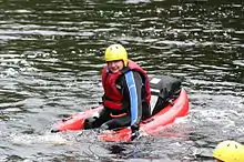River Bugging is a whitewater sport where a single person navigates a stretch of river in a craft known as a River Bug.[1] The river bug is a small inflatable craft with an inflatable tube at each side of the user and an inflatable back rest behind. The user sits between the tubes and can be secured into the craft by means of a waist strap.
