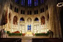 The chancel is directly north of the nave, slightly raised above it and separated from the nave by a limestone railing with 20 quatrefoil medallions. The western portion of the rail contains a pulpit with a wooden canopy and three carved limestone blocks.[160][165] A labyrinth composed of three types of marble; it was inspired by a similar design at Chartres Cathedral and is inlaid in the middle of the chancel floor. The labyrinth is flanked on both sides are four rows of oaken choir stalls with carvings of Psalms texts.[160][166] To the north, behind the choir stalls, is the organ console.[166] A communion table made of Caen stone is near the back of the chancel in the center, behind which is a baptismal pool.[166][163]