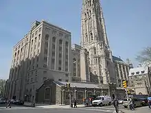 Morningside Heights, where the new church was to be located, was being quickly developed as a residential neighborhood surrounded by numerous higher-education institutions, including Union Theological Seminary and International House of New York.[29][30] The development had been spurred by the presence of Riverside Park and Riverside Drive nearby, as well as the construction of the New York City Subway's Broadway–Seventh Avenue Line—the modern-day 1 train—under Broadway.[18][29] Rockefeller briefly considered a location on Morningside Drive on the eastern edge of Morningside Heights, between 117th and 118th Streets.[21] He ultimately chose a larger site at the southeastern corner of Riverside Drive and 122nd Street on the neighborhood's western border, which overlooked Riverside Park to the west and Claremont Park to the north.[30][31] Rockefeller felt the Riverside Drive site was more easily visible because it abutted the Hudson River and would be seen by recreational users of Riverside Drive.[31]