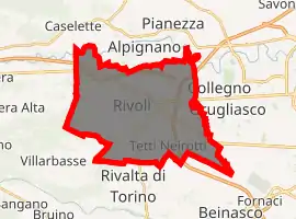 Rivoli borders the following municipalities: Turin, Pianezza, Caselette, Alpignano, Collegno, Rosta, Grugliasco, Villarbasse, Rivalta di Torino, Orbassano.