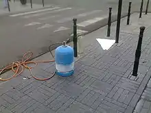 Preformed thermoplastic pavement markings (sometime called "tape", but not to be confused with preformed polymer tape) are thermoplastic cut into the final shapes by the manufacturers and ready to position onto an asphalt or concrete pavement surface. Preformed thermoplastics are put into place on the road surface and applied using a propane heat torch. Some models require heating the road surface prior to the placement of the preformed thermoplastics. These markings are used primarily because of their durability and cost-effective service life. Since the plastics are melted into the surface, they are not easily damaged by the snowplows. Typically, the preformed thermoplastic markings can last 3 to 6 years. The most common applications of preformed thermoplastic pavement markings are found at intersections as transverse markings such as stop lines, legends, crosswalks, arrows, bike lane symbols, and accessibility symbols.[12][14]