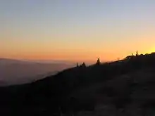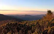 Roan Mountain is the highpoint of the Unaka Range of the Southern Appalachian Mountains, located in the Southeastern United States. The mountain is clad in a dense stand of Southern Appalachian spruce-fir forest, and includes the world's largest natural rhododendron garden, and the longest stretch of grassy bald in the Appalachian range.[3] The Cherokee National Forest and Pisgah National Forest converge atop the mountain, with Roan Mountain State Park located near its northern base. The Appalachian Trail traverses most of the Roan's crest. The Roan High Knob Shelter is the highest back-country shelter on the entire 2,174-mile (3,499 km) trail.[4]