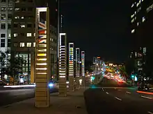 At its southern end, the street forms the western boundary of the Montreal International Quarter, with a colonnade of pillars encasing a stylized representation of the flags of the world.[2]