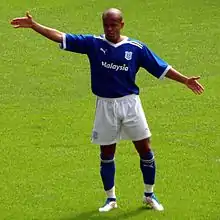 The following season proved to be a breakout year for Earnshaw as he established himself in the first team, scoring 25 goals in all competitions including hat-tricks in a league match against Torquay United and a third round FA Cup tie against Bristol Rovers.[14] His form saw him receive Cardiff's Young Player of the Year award and saw him named in the Football League Third Division PFA Team of the Year.[13] In the 2002–03 season, Earnshaw scored on the opening day of the season in a 2–1 victory over Oldham Athletic but was used largely as a substitute in the opening month after manager Lennie Lawrence opted to play Andy Campbell after Earnshaw failed to score in pre-season.[21] However, on 11 September 2002 he was handed a start against Boston United in the League Cup and scored a hat-trick. He went on to enjoy a prolific season, scoring two further hat-tricks in matches against Queens Park Rangers and Tranmere Rovers and also scored six braces, as Cardiff won promotion to the First Division after defeating Queens Park Rangers in the 2003 Football League Second Division play-off Final at the Millennium Stadium.[22][23] He finished the season with 35 goals in all competitions, despite scoring only once in his last eleven matches, breaking a club record for most goals scored in a single season which was previously held by Hughie Ferguson's tally of 32 during the 1926–27 season. His 31 goals in league matches also broke a 56-year-old club record previously held by Stan Richards.[13][24] At the end of the season, Earnshaw was named Young Welsh Footballer of the Year, and was named in the PFA Division Two Team of the Year.[25] Following the club's promotion, Earnshaw continued his form and scored over 30 goals during his first season in the First Division, including a four-goal haul during a 5–0 victory over Gillingham and a hat-trick against Leyton Orient in the League Cup.[26]