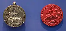 ![]() Seal of Fitzwalter, Latin legend: SIGILLUM ROBERTI FILII WALTERI ("seal of Robert son of Walter"). Shows a mounted knight with closed flat-topped helmet at full-gallop towards sinister with a dragon under horse's hooves. He holds a sword aloft in the right hand. Fitzwalter's arms are shown in half-view on knight's heater shield and in full on horse's trapper, and a shield with the arms of his ally Saer de Quincy, 1st Earl of Winchester is in front of the horse: 7 mascles 3:3:1. Modern imprint from original die in the British Museum.[1] | |