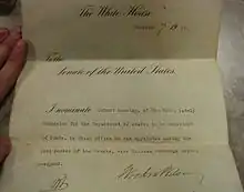 In 1919, Lansing became the nominal head of the US Commission to the Paris Peace Conference. Because he did not regard the League of Nations as essential to the peace treaty, Lansing began to fall out of favor with Wilson, for whom participation in the League of Nations was a primary goal. During Wilson's stroke and illness, Lansing called the cabinet together for consultations on several occasions. In addition, he was the first cabinet member to suggest that Vice President Thomas R. Marshall assume the powers of the presidency. Displeased by Lansing's independence, Edith Wilson requested Lansing's resignation. Lansing stepped down from his post on February 12, 1920.[4][5]