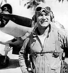 A member of VMF-215 flying the F4U-1 Corsair, the ace was shot down twice. The first time, a Zero caught him over Bougainville Island. Bringing his plane down on the ocean, he paddled for six hours in a rubber life raft before being rescued by the USS Sigourney (DD-643). His second and fatal crash occurred one day before his twenty-fourth birthday. He was last seen on February 3, 1944, when his plane crashed into the sea after a cancelled (due to overcast) fighter sweep mission over Rabaul, New Britain. He was attempting to destroy a lighthouse on Cape St. George, Southern New Ireland, that often gave the fighter group trouble by firing flak at the fighter group as they passed the lighthouse. His squadron leader Capt. Harold L. Spears watched as he attempted to land his damaged plane in the water during rough seas. His plane cart wheeled when one of the wings grabbed a wave and the plane disintegrated. He had no time to escape the cockpit, thus sank with his plane. He was subsequently declared killed in action.[2] He has cenotaph memorials at Manila, Philippines and Newton, Massachusetts.[3]