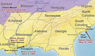 Smalls, having just turned 23, quickly became known in the North as a hero for his daring exploit. Newspapers and magazines reported his actions. The U.S. Congress passed a bill awarding Smalls and his crewmen the prize money for the Planter (valuable not only for its guns but low draft in Charleston bay); Southern newspapers demanded harsh discipline for the Confederate officers whose joint shore leave had allowed the slaves to steal the boat.[16] Smalls's share of the prize money came to US$1,500 (equivalent to $38,415 in 2019). Immediately after the capture, Smalls was invited to travel to New York to help raise money for ex-slaves, but Admiral DuPont vetoed the proposal and Smalls began to serve the Union Navy, especially with his detailed knowledge of mines laid near Charleston. However, with the encouragement of Major General David Hunter, the Union commander at Port Royal, Smalls went to Washington, D.C., in August 1862 with Rev. Mansfield French, a Methodist minister who had helped found Wilberforce University in Ohio and had been sent by the American Missionary Association to help former slaves at Port Royal.[17] They wanted to persuade Lincoln and Secretary of War Edwin Stanton to permit black men to fight for the Union. Although Lincoln had previously rescinded orders by Hunter and Generals Fremont and Sherman to mobilize black troops,[17] Stanton soon signed an order permitting up to 5,000 African Americans to enlist in the Union forces at Port Royal. Those who did were organized as the 1st and 2nd South Carolina Regiments (Colored). Smalls worked as a civilian with the Navy until March 1863, when he was transferred to the Army. By his own account, Smalls was present at 17 major battles and engagements in the Civil War.[2]