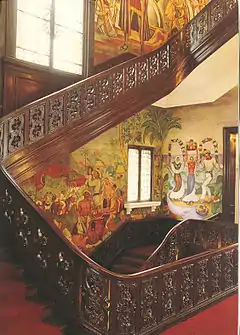 In 1933 Cueva del Río began work on the Embassy frescos, with the themes: La Fiesta de las Flores y Frutas en Tehuantepec (Flowers and Fruits party in Tehuantepec), also called Fiesta Tehuana; Los Volcanes, Fraternidad Panamericana (The volcanoes and Pan-American fraternity). The fresco created great expectations in Mexico. "El Nacional" newspaper published a head note on June 19, 1934 about the visit of the artist back to Mexico. "Now is among us the great Mexican painter Roberto Cueva del Río" with a deeply exaltation, pointing that: "The fresco that he is creating in the embassy will be the biggest worldwide, due the walls around the central stair has a picture continuity and ideological solution from the floor to the ceiling. Cueva del Río makes next to José Clemente Orozco, Diego Rivera and David Alfaro Siqueiros, the quadrangle of the best paintbrush artists with real work outside of Mexico". In this mural we can see Carlos Fuentes in his youth.