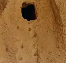 In these cases too, a large portion of the rooms are connected by a branched tunnel system. The entrances are usually open, since the main point was not really to be hidden, like the underground cities. Nevertheless, entry is sometimes made very difficult by the fact that the vertical cliff-faces had to be clambered up using simple hand and footholds. Inside the internal tunnel system, too, moving around is made difficult by steep, narrow passageways and vertical chimneys. In many of these places, dovecotes are carved in the high cliff walls, often with colourfully painted entrance holes. The colour would attract the birds, which then made their nests in them. These dovecotes were accessed once a year by difficult climbing manoeuvres and the birds' excrement was then collected for use as fertiliser.[10][11] Pre-existing holes were also converted into dovecotes by cutting niches for nests and walling up entrances.