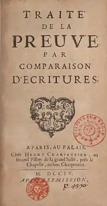 Cover page of Traité de la preuve par comparaison d'écritures by Roland Le Vayer de Boutigny (Paris : 1704). (Paris BNF).