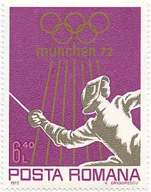 Fencing at the 1972 Summer Olympics on a Romanian stamp