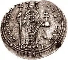 Zoë and Michael were married on the same day that Romanos III died.[27] The next day the couple summoned the Patriarch Alexios I to officiate in the coronation of the new emperor.[28] Although he initially refused to co-operate, the payment of 50 pounds of gold helped change his mind.[27] He proceeded to crown Michael IV as the new emperor of the Romans.[29][30]