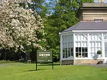 The Mansion House is a large stone two- and three-storey house in Greek Revival style with a view over the Upper Lake, built from 1811 to 1826. It was built for Thomas Nicholson and his wife Elizabeth, who took up residence in 1816. It had three carriage houses and stabling for 17 horses. It was bought by the City of Leeds in 1871, and the sale document noted that the principal rooms on the ground floor were 13 feet high, and on the first floor were 17 bedrooms and 2 water-closets.[2]