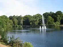 It was originally used for boating, and for a period there were trips around it in a steamboat called the Maid of Athens (which was sunk in the lake at the end of its useful life[2]). In 1900 this was replaced by an electric launch, the Mary Gordon, which operated until 1923.[25] A cafe was constructed above the boathouse. The lake is now used for fishing, but not boating. The lower part ends in a dam which included a sluice and waterfall from at least 1893.[26] By 1921, the waterfall fed a bathing pool at the bottom of the dam,[27] but both features have since been removed, and the overflow from the lake is now by a weir at the western end of the dam.[28]