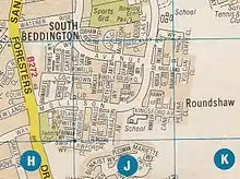 Roundshaw was built on the site of the former Croydon Airport which once occupied the buildings of the first Croydon Aerodrome (originally named 'Plough Lane') which was demolished in 1928. The estate is commemorated in various ways; the naming of roads after aircraft, personalities, and firms linked with aviation to recall the airport's history: Mollison Drive, Lindbergh Road, Olley Close, Avro Way, Brabazon Avenue among other related aviation names.[1] The name of the estate comes from Roundshaw Park on the edge of the site, named from a round 'shaw' or grove of trees.[2]